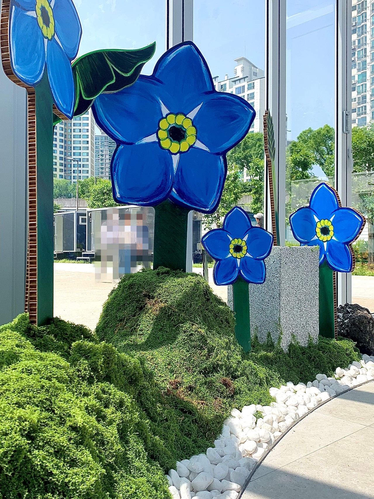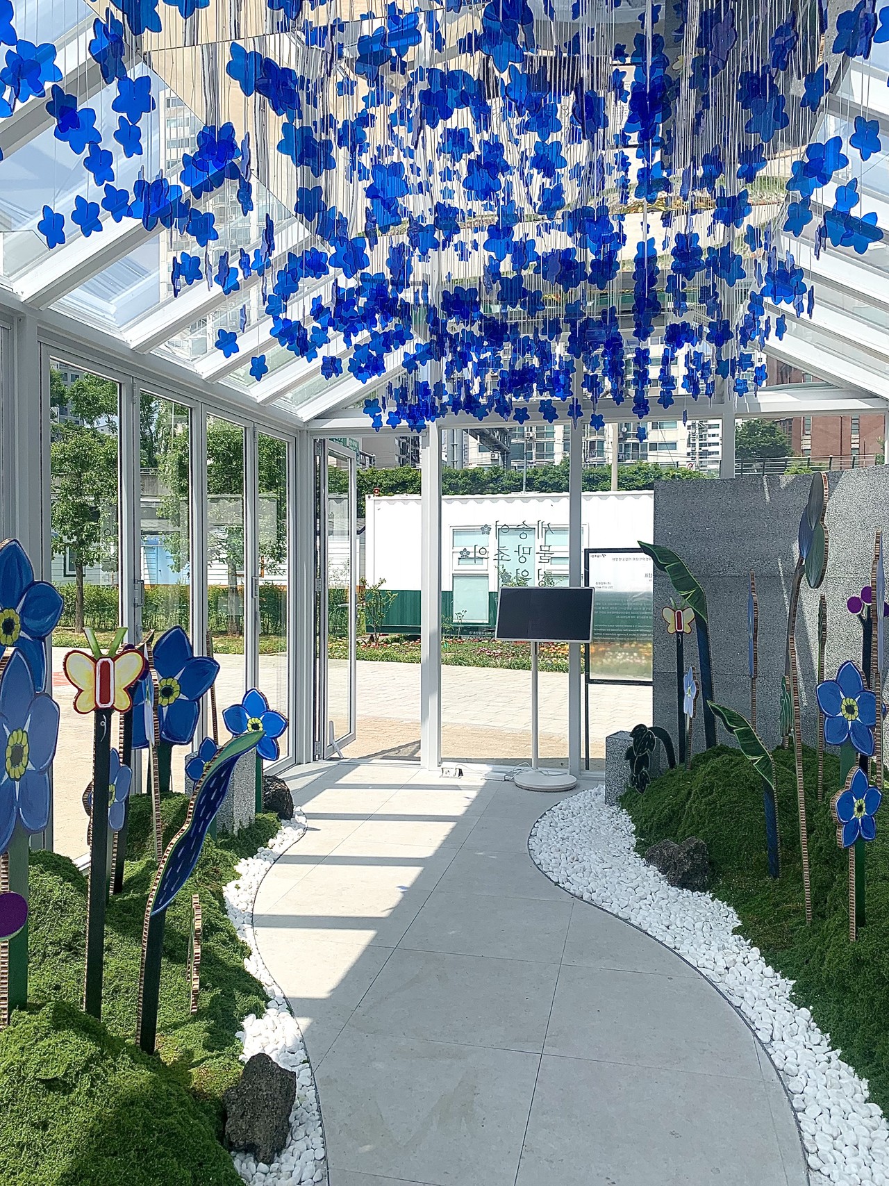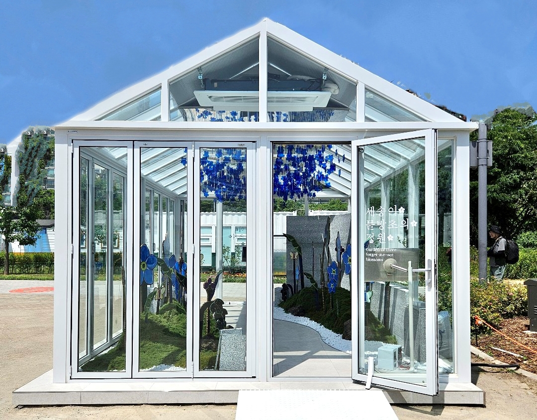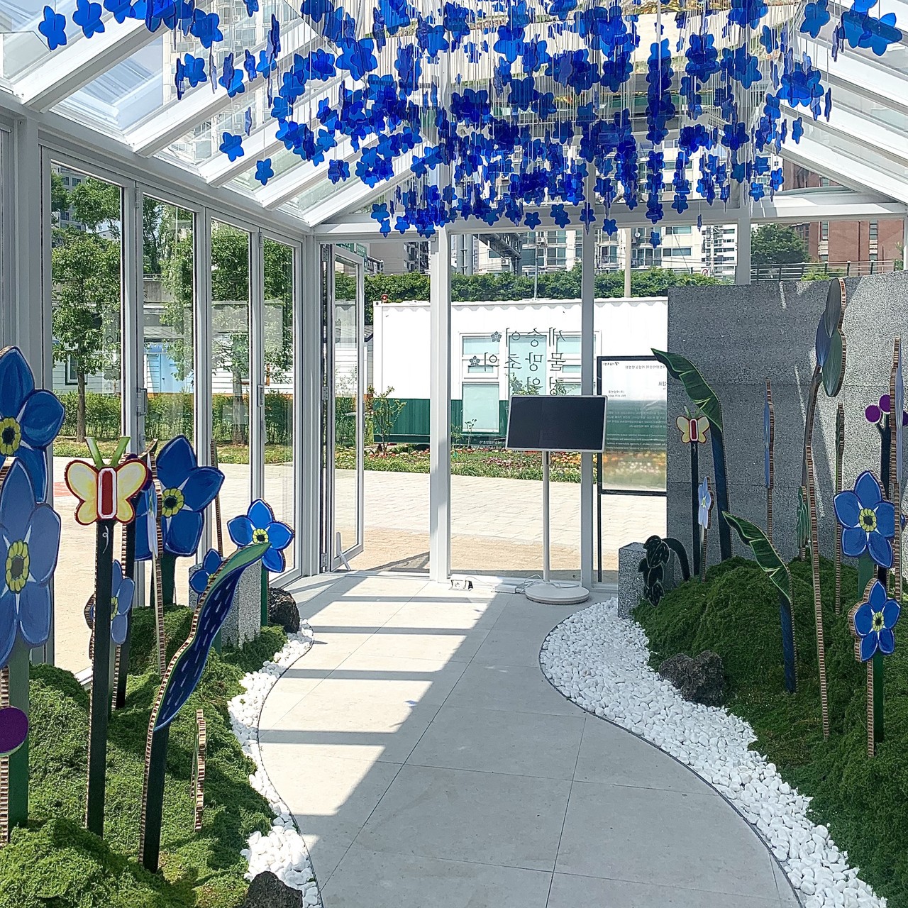 Artistic Space: 화이트 프레임의 글라스 하우스 전면에 나난 강 작가의 물망초 그림을 입혀, 햇살이 비칠 때마다 내부로 떨어지는 파란 꽃 그림자가 몽환적인 공간감을 선사합니다.