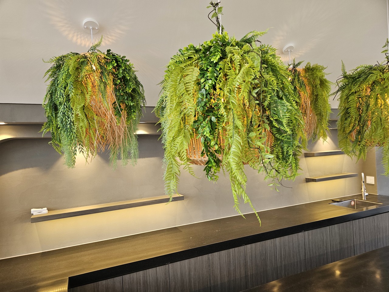 Design: 야자수와 알로카시아, 고사리류를 층층이 레이어링하여 숲의 깊이감을 표현하고, 우드 인테리어와 어우러지는 따뜻하고 내추럴한 무드를 연출했습니다.