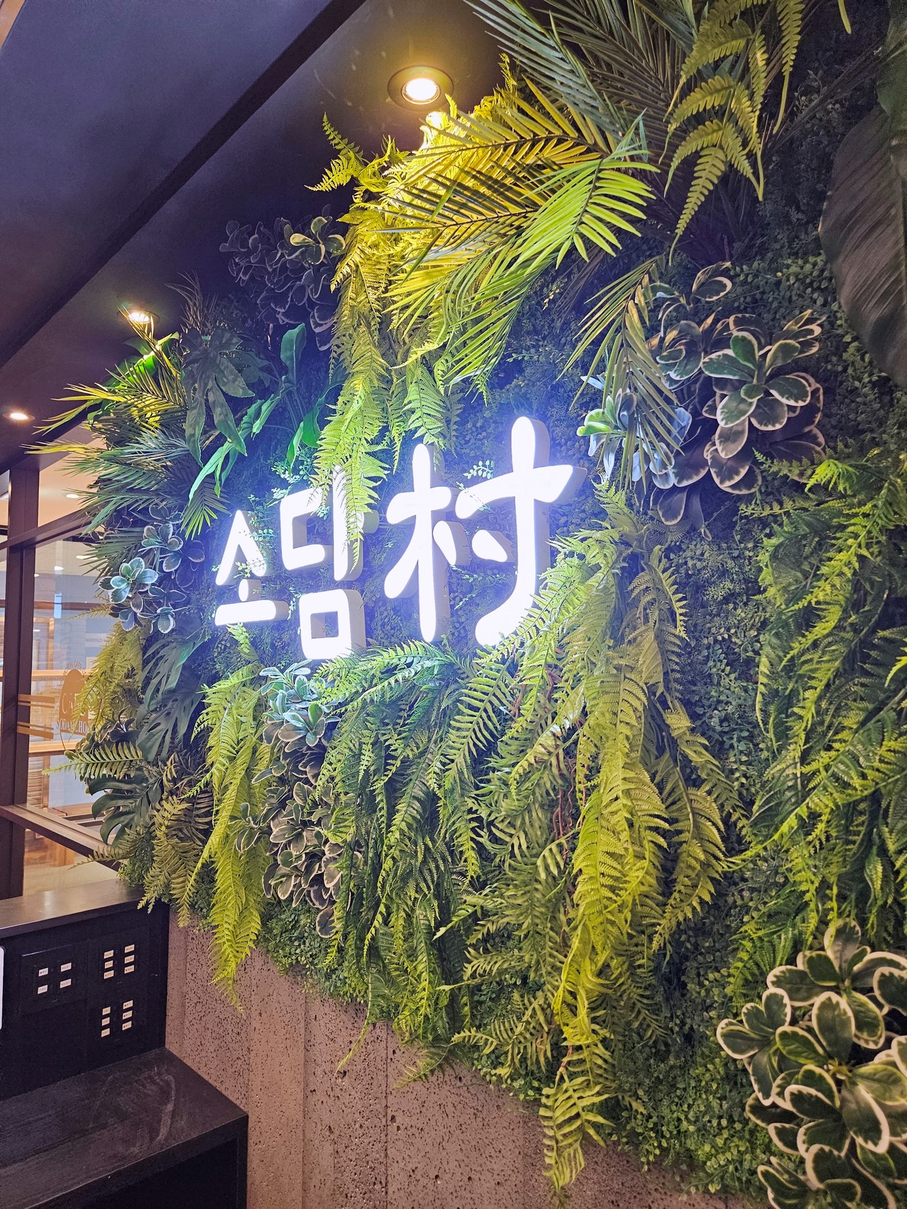 건강한 음식을 제공하는 브랜드 이미지에 맞춰, 방문객의 시선이 가장 먼저 머무는 입구 벽면을 울창한 수풀의 생명력으로 채웠습니다.