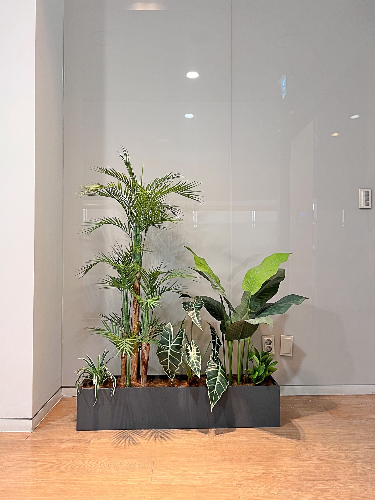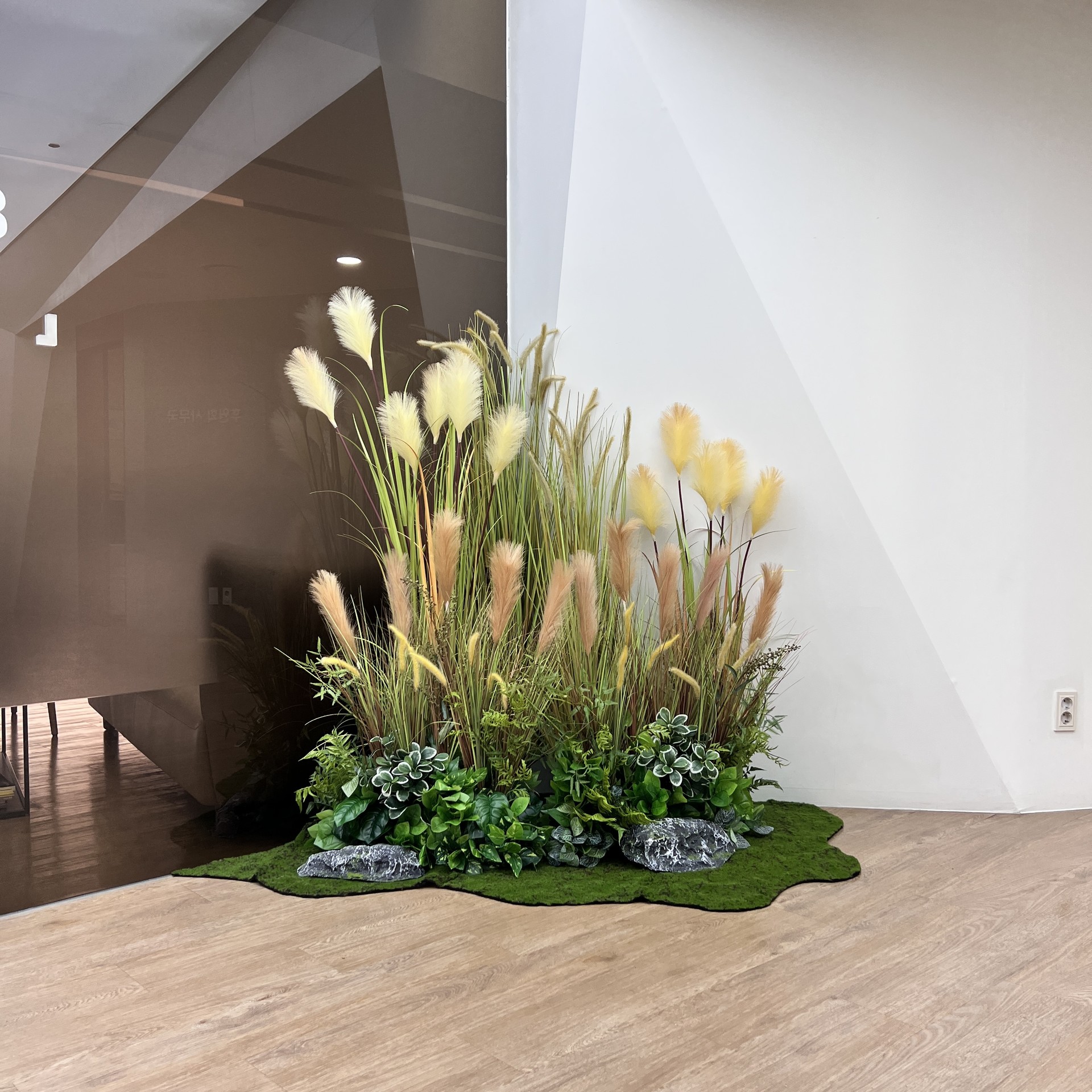 ◦ Materials: 인조 관엽 식재, 팜파스그라스, 인조 이끼, 자연석, 그레이·화이트 플랜터