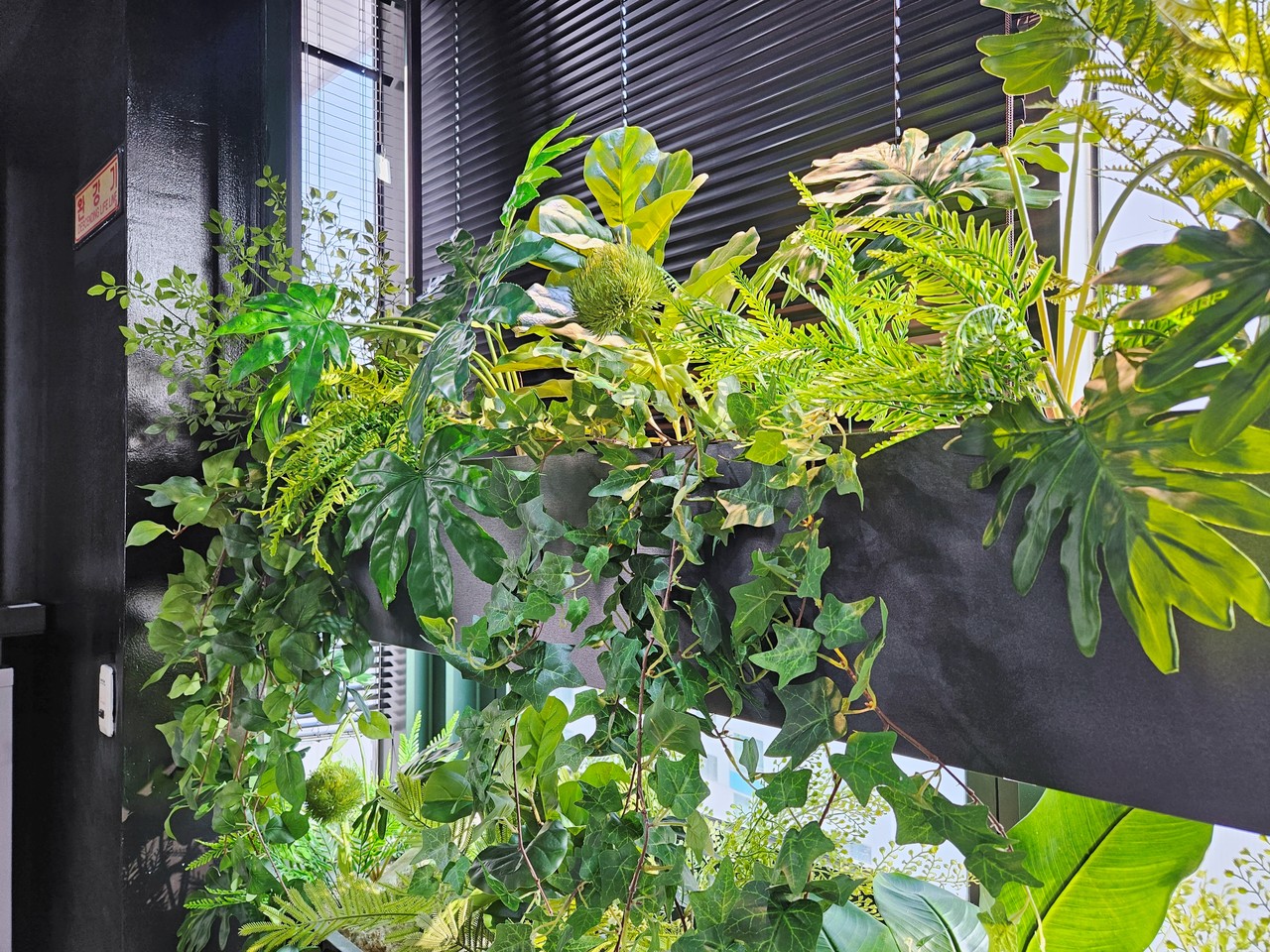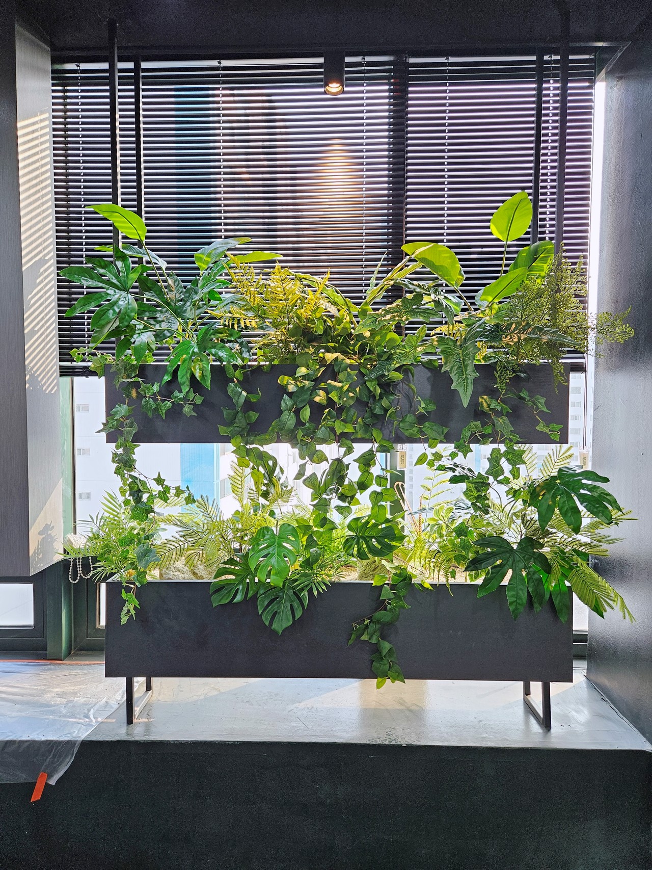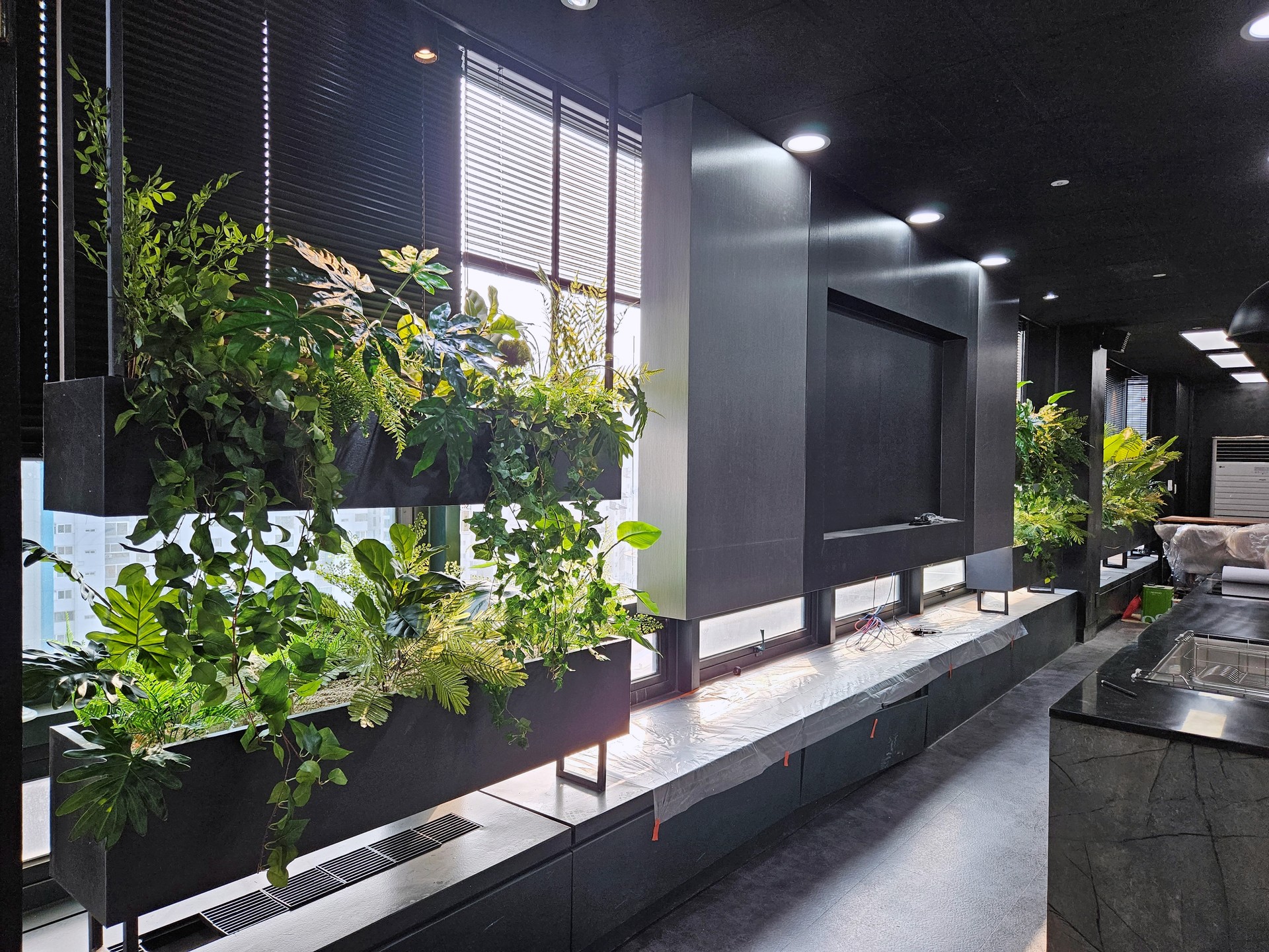 ◦ Materials: 인조 관엽 수목(야자, 극락조, 몬스테라), 맞춤형 블랙 플랜터, 넝쿨 식재