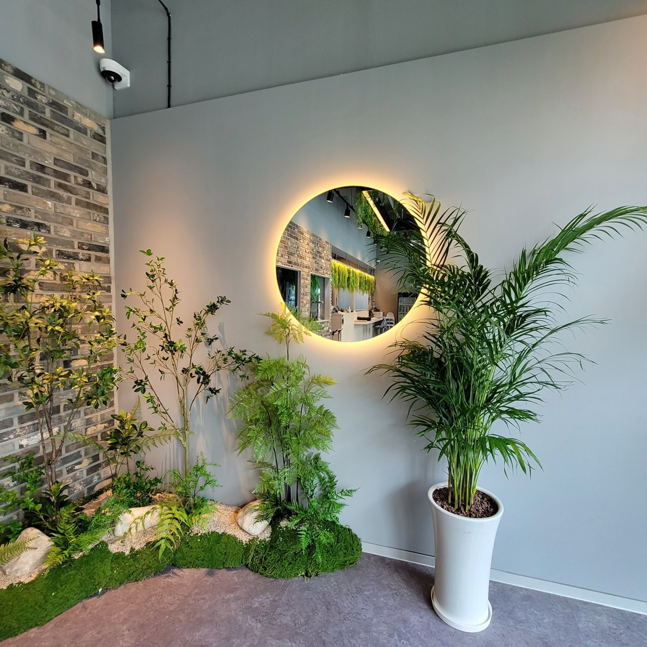 . ◦ Design: 대형 블랙 사각 프레임을 활용해 천장 조명과 식재를 결합하여 모던하면서도 유기적인 동선을 구현했습니다. ◦ Detail: 벽면을 따라 흐르는 넝쿨 식재와 공중에 띄운 행잉 플랜트를 믹스하여 공간 전체에 싱그러운 볼륨감을 극대화했습니다.