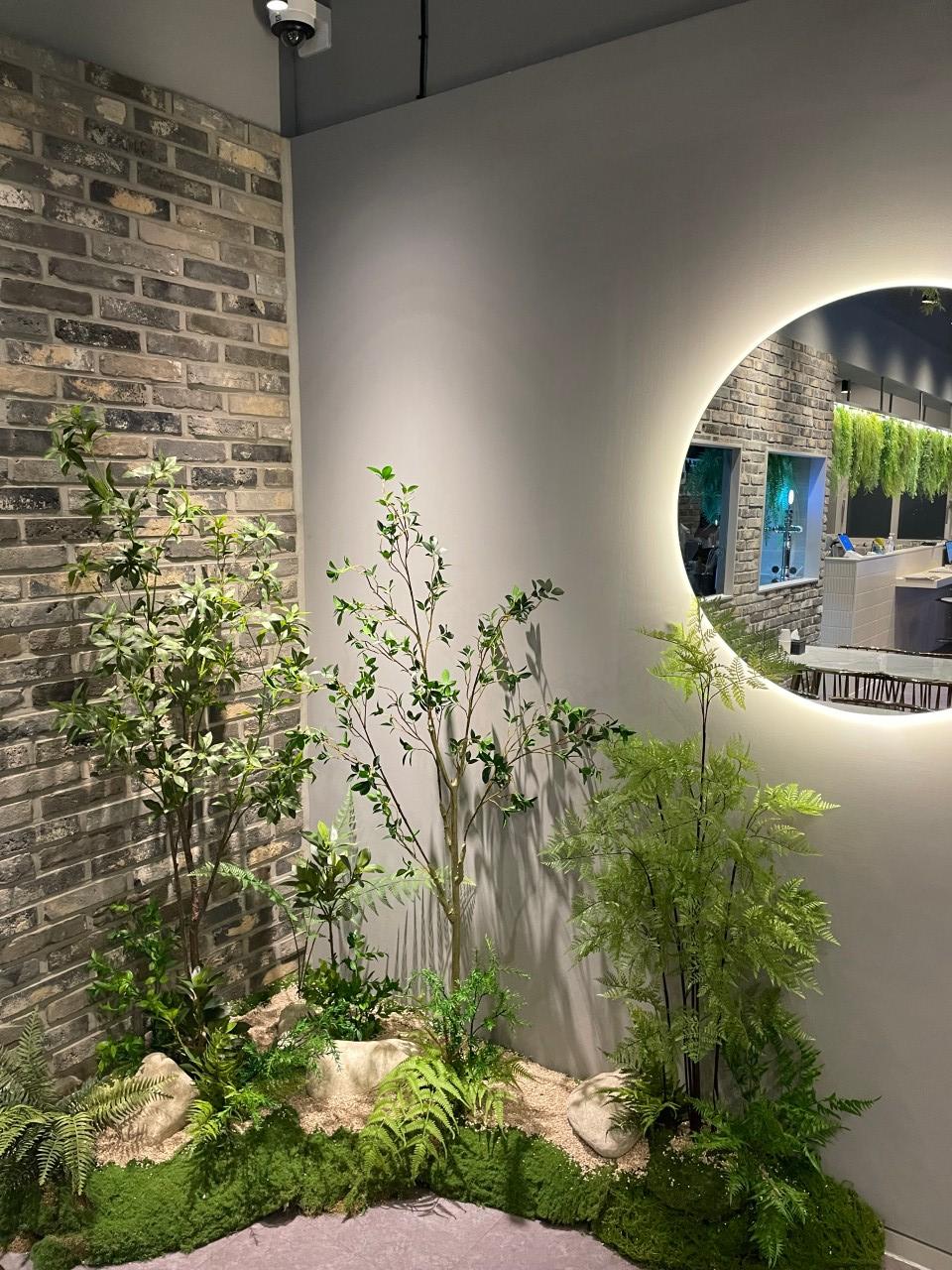 ◦ Materials: 인조 넝쿨 식재(아이비, 고사리류 등), 블랙 철제 프레임, 스포트라이트 조명