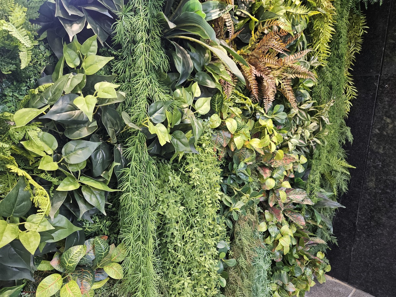 ◦ Detail: 서로 다른 질감과 톤을 가진 식재들을 정교하게 레이어링하여 평면적인 벽면에 실제 숲과 같은 입체적인 볼륨감을 완성했습니다.