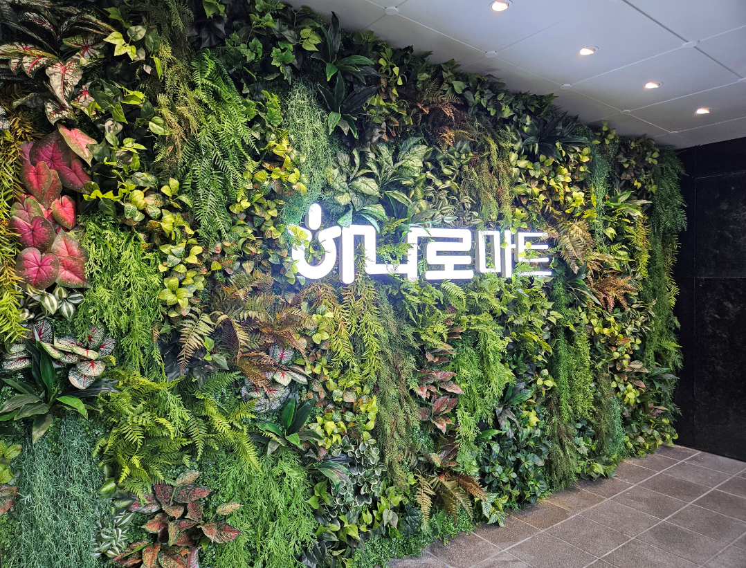 ◦ Design: 벽면 전체를 캔버스 삼아 다양한 식재를 배치하고, 중앙에 밝은 LED 로고를 결합하여 브랜드 인지도를 극대화했습니다.