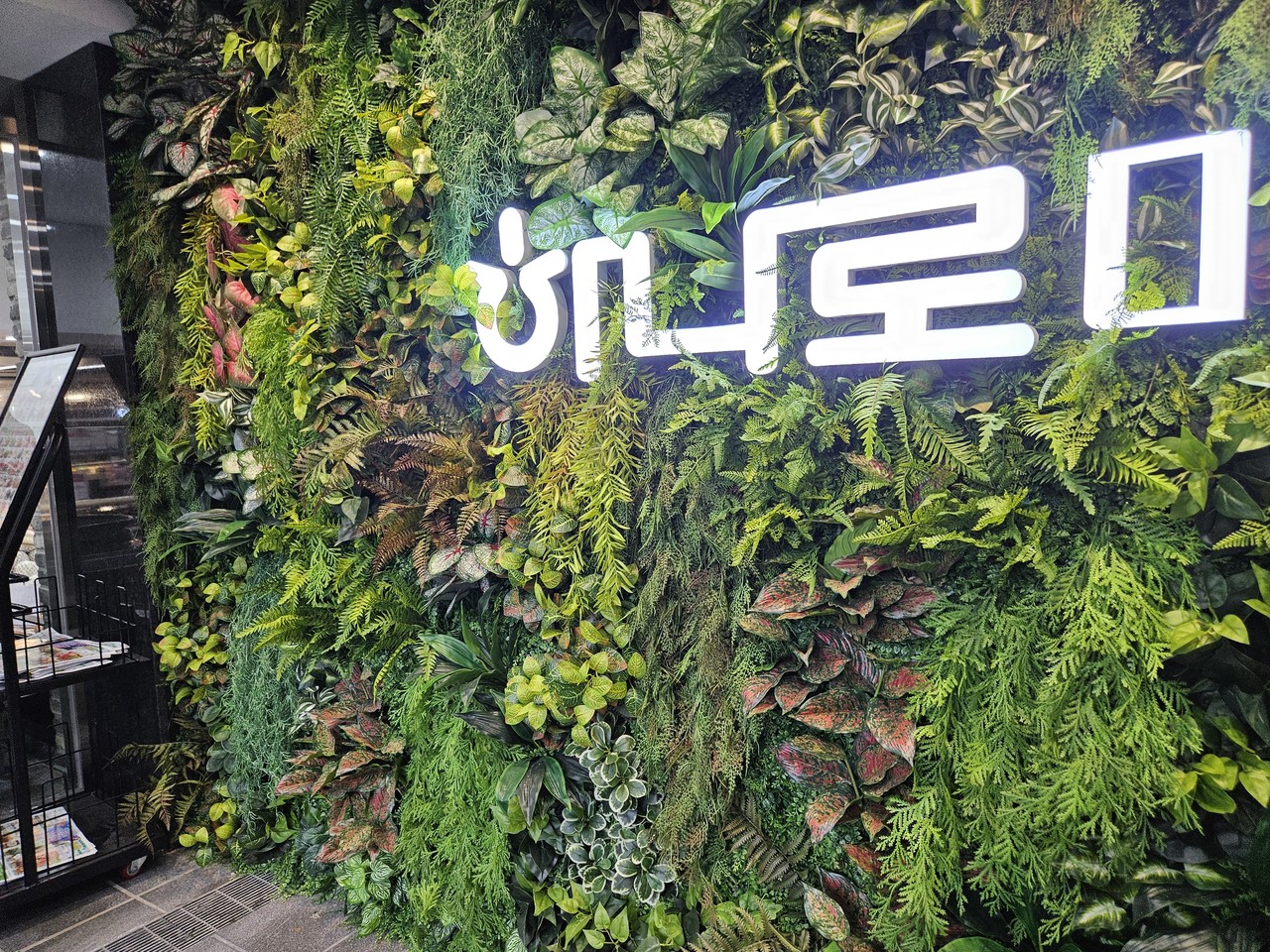 ◦ Materials: 다채로운 인조 관엽 식재(고사리, 넝쿨류 등), LED 채널 사인, 벽면 고정 프레임