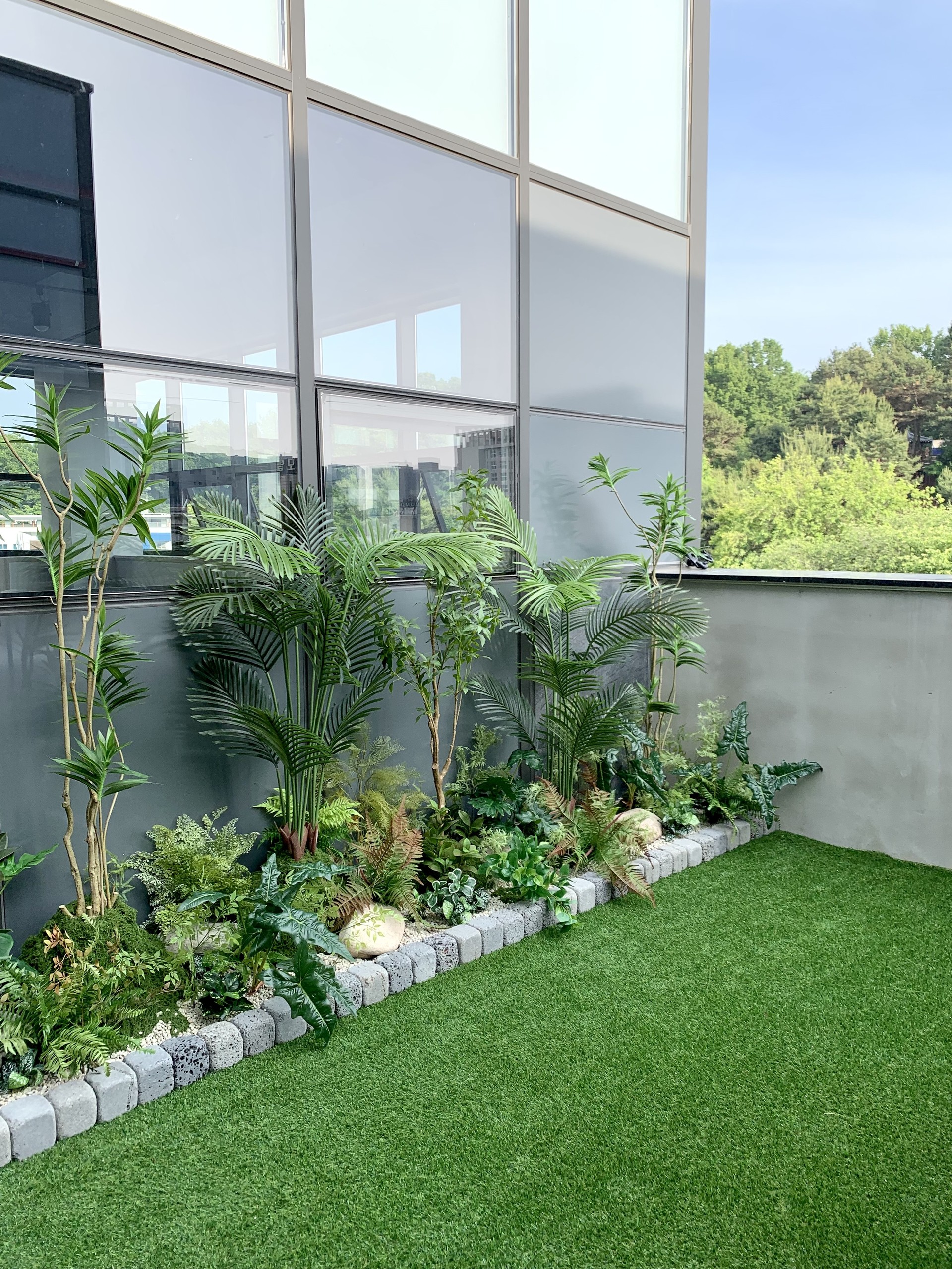 ◦ Design: 현무암 경계석과 인조 잔디를 활용해 정갈한 화단 라인을 구축하고, 대나무 스크린으로 시각적 차폐와 아늑한 분위기를 동시에 확보했습니다.
