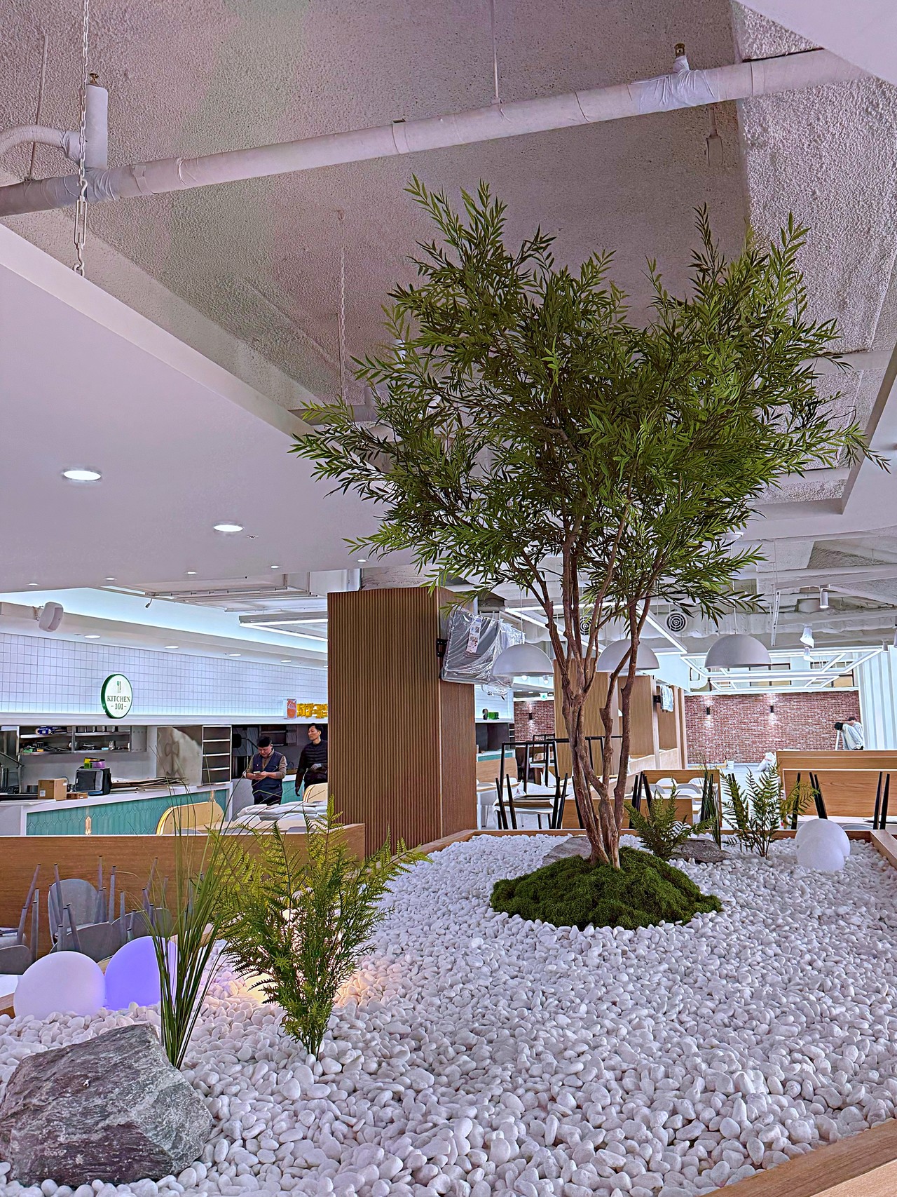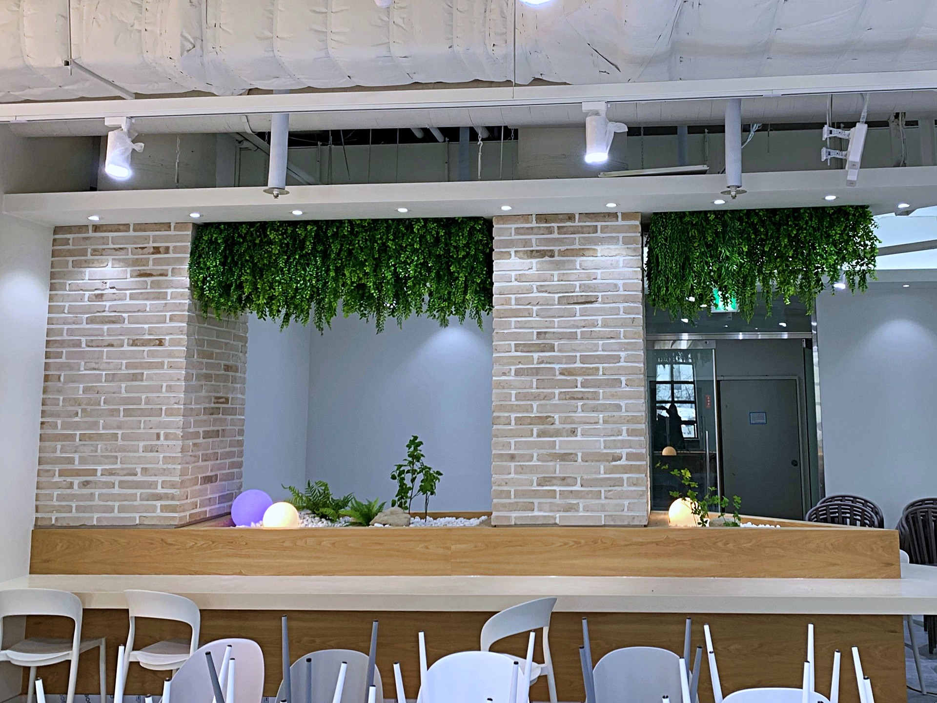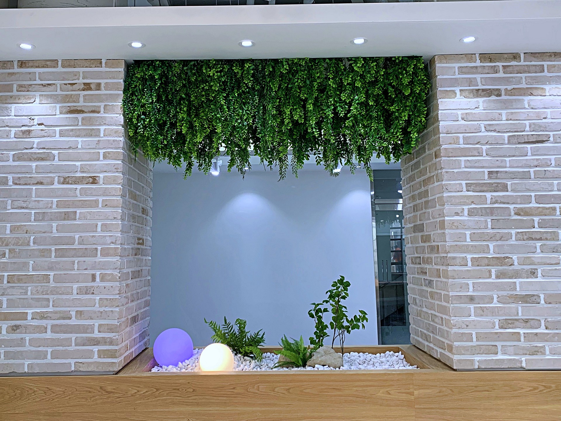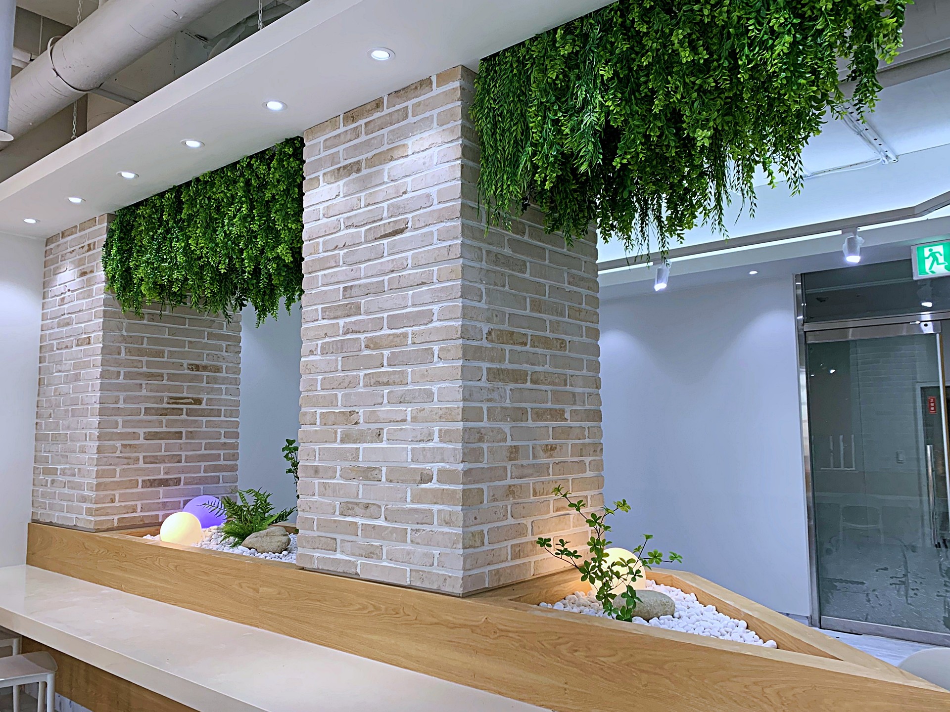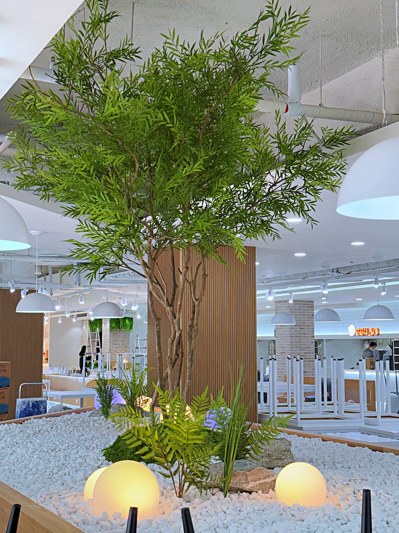 ◦ Materials: 인조 수목, 행잉 플랜트, 고사리류, 백자갈, 자연석, 구형 오브제 조명, 우드 플랜터