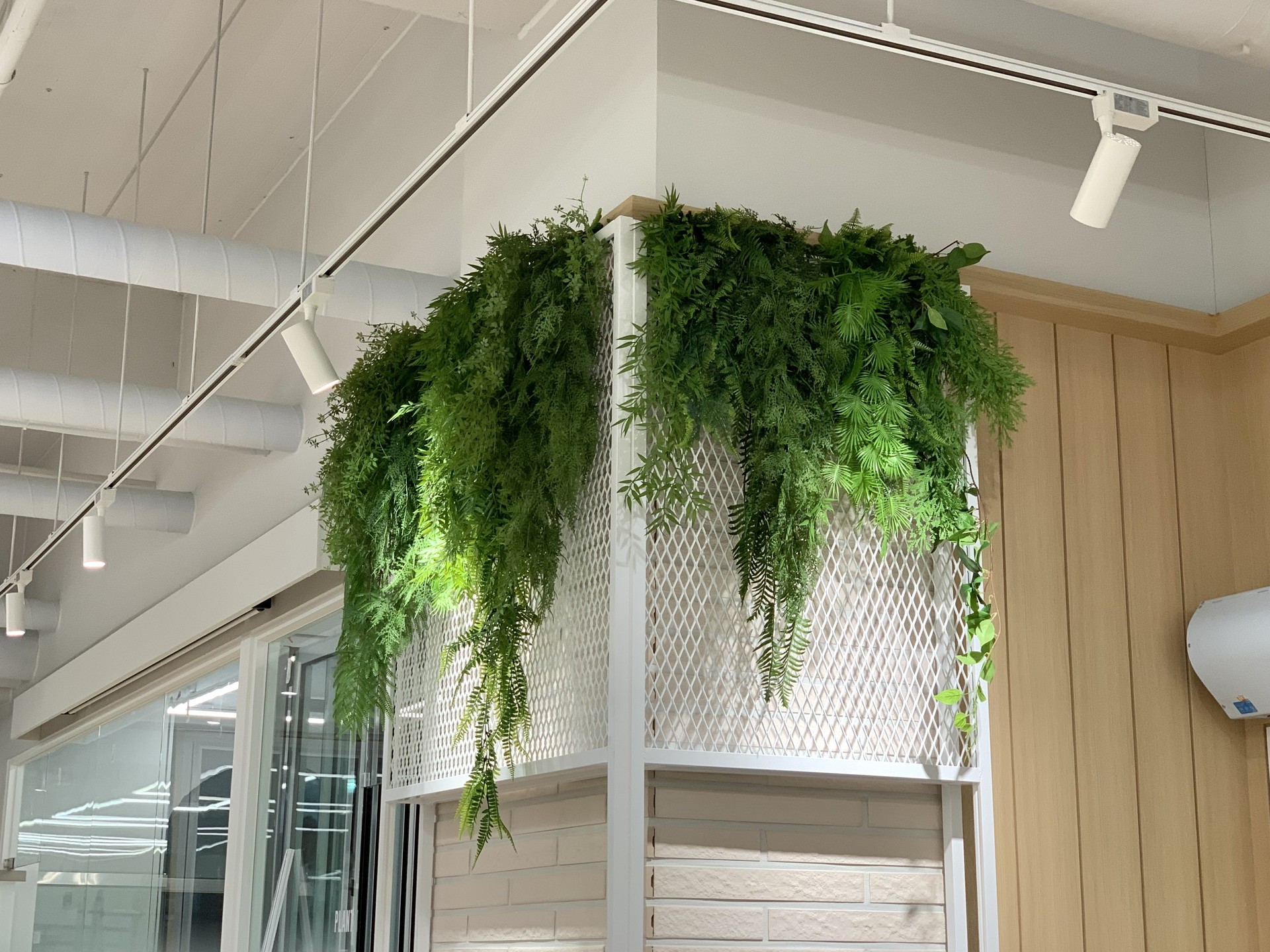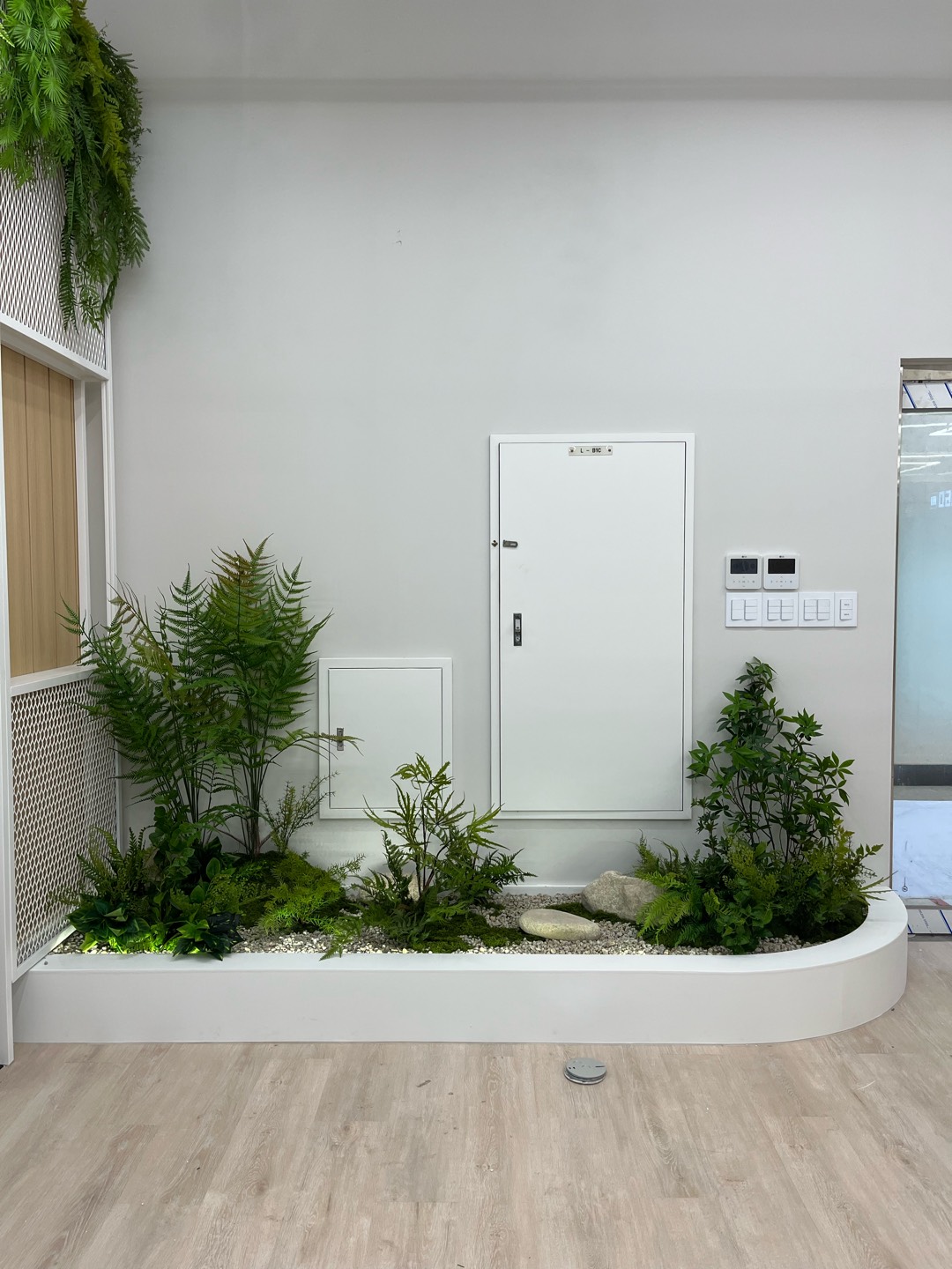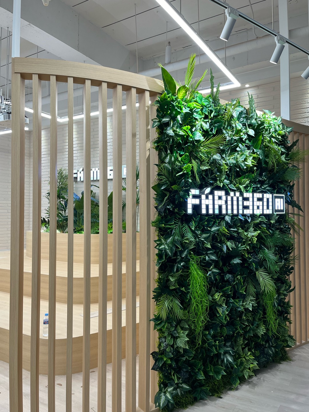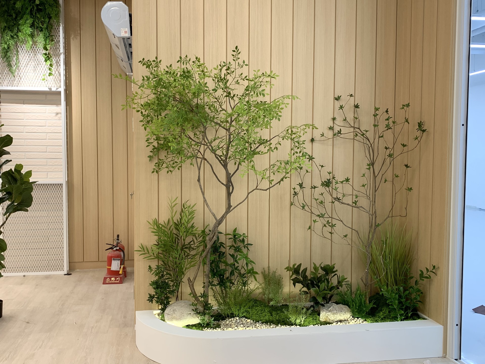 ◦ Materials: 인조 관엽 식재, 고사리류, 벽면 녹화 식재, 맞춤형 우드 플랜터, LED 채널 사인