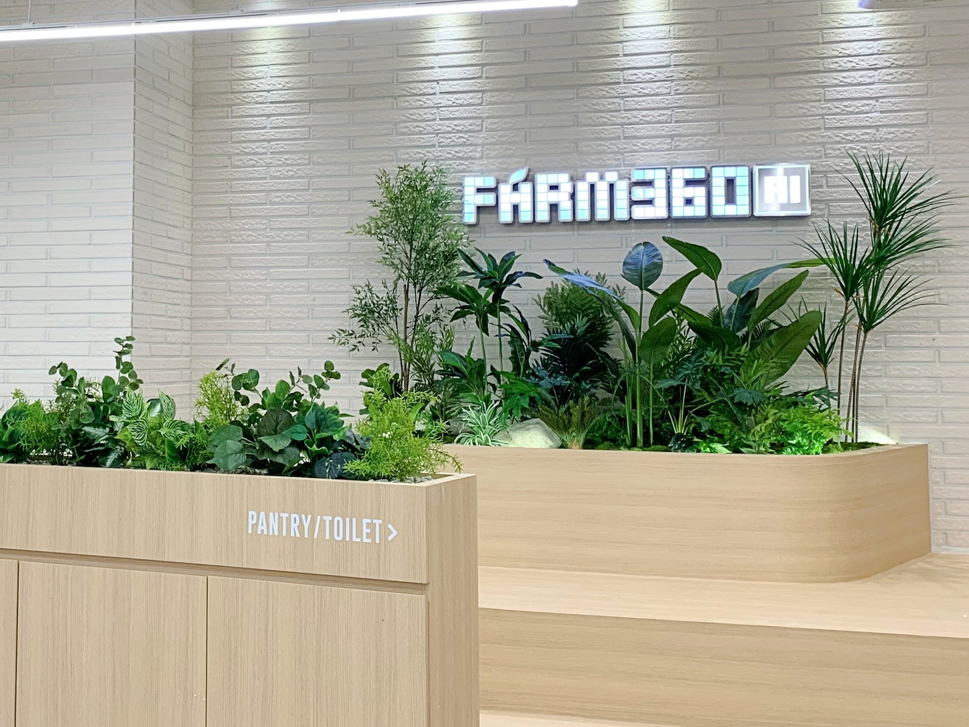 ◦ Design: LED 로고 사인을 중심으로 식재를 배치해 브랜드 인지도를 높이고, 우드 슬랏 파티션과 식재의 선형미를 연결해 공간의 일체감을 더했습니다.