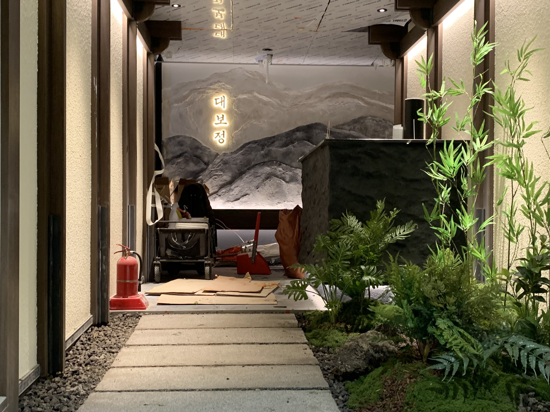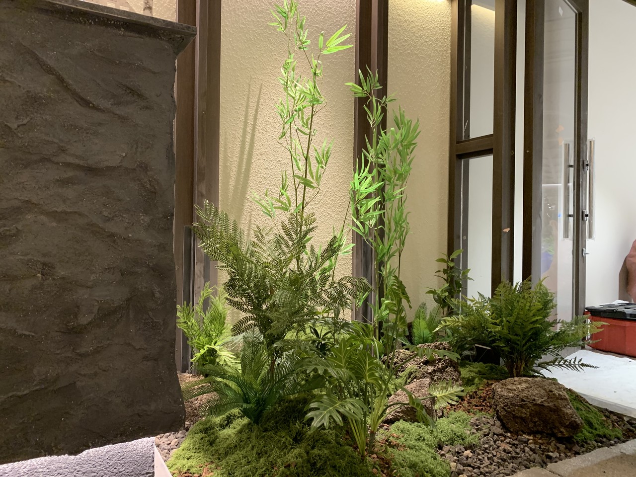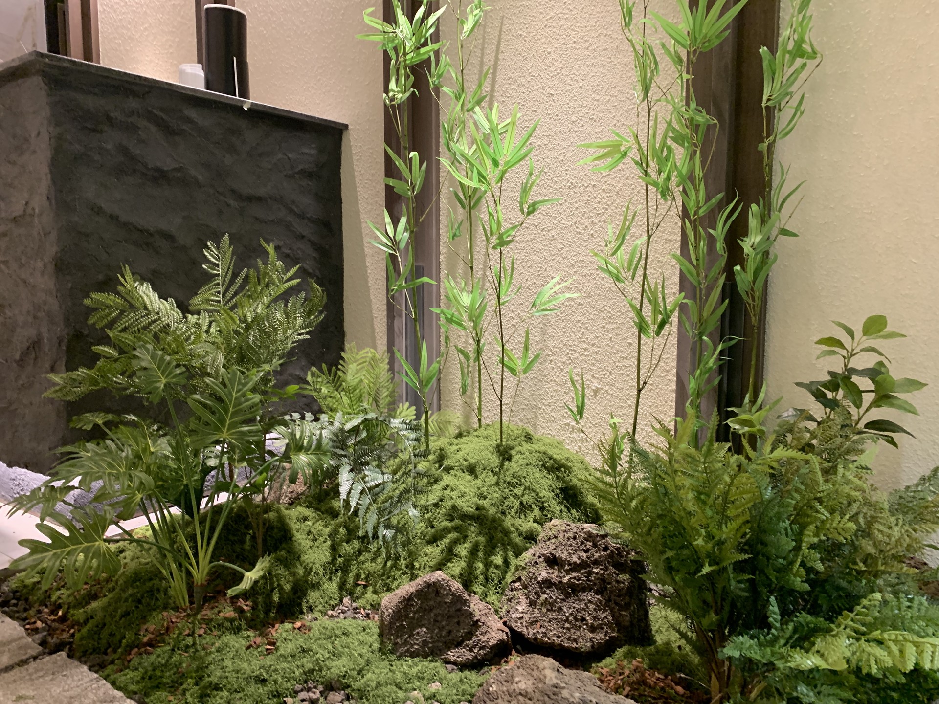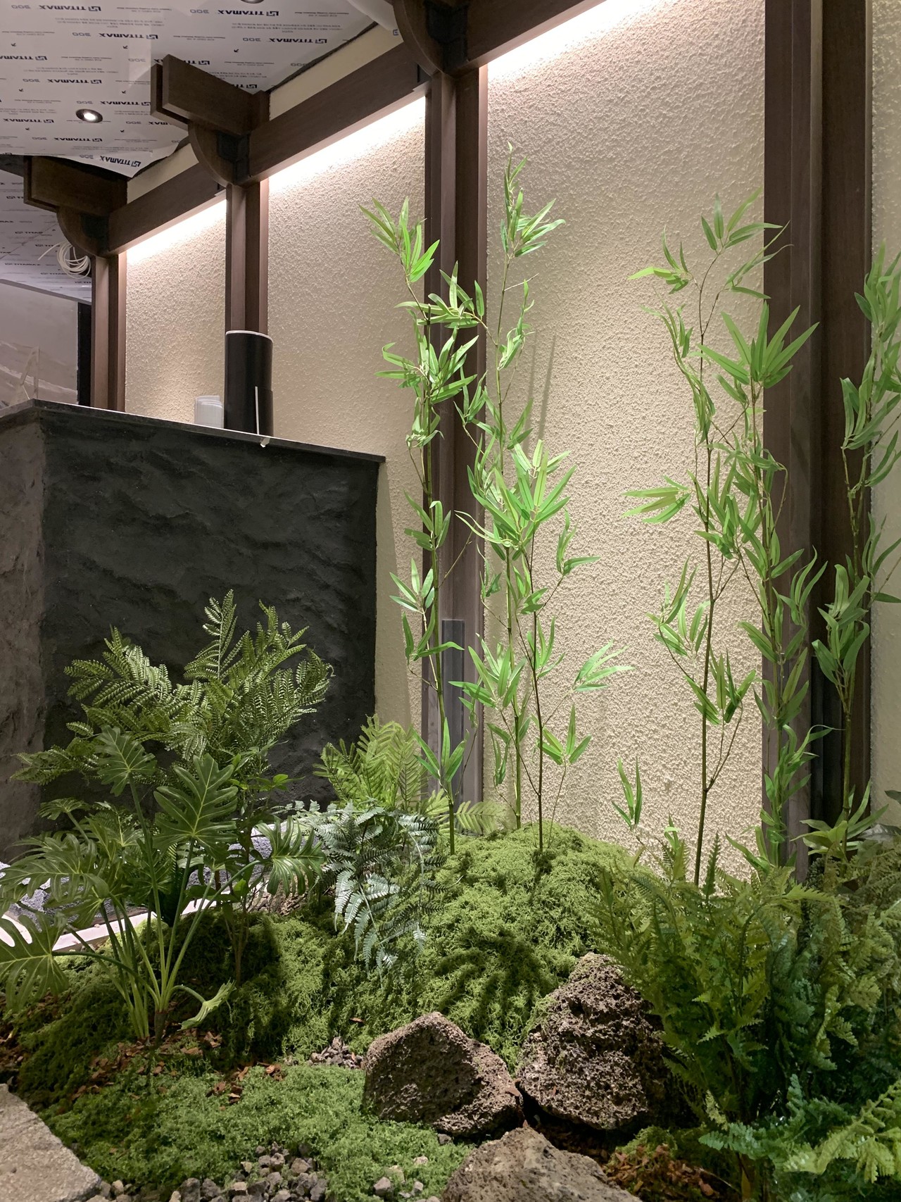 ◦ Materials: 인조 대나무, 고사리류, 인조 이끼, 자연석, 디딤석, 산세 부조 월, 간접 조명