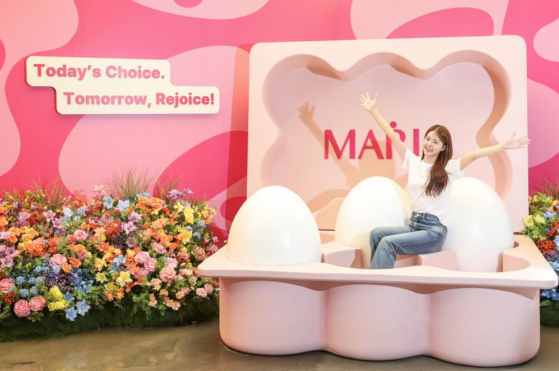 ◦ Design: 비비드한 핑크 월을 배경으로 압도적인 스케일의 에그 오브제를 배치하여 브랜드 정체성을 시각적으로 강조했습니다.