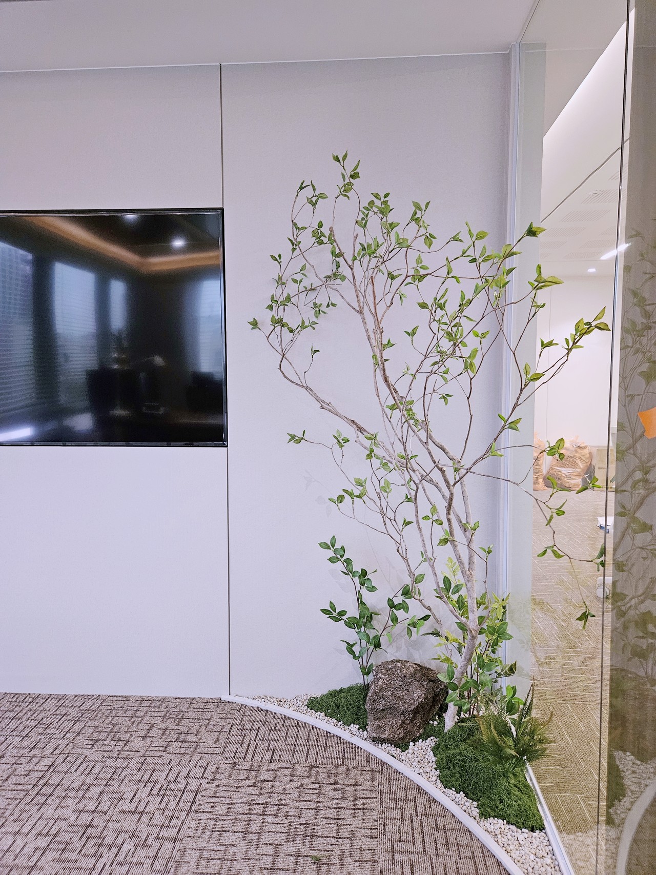 ◦ Materials: 대형 관엽 식재(여인초 등), 인조 수목, 고사리류, 백자갈, 간접 조명, 곡선형 가벽