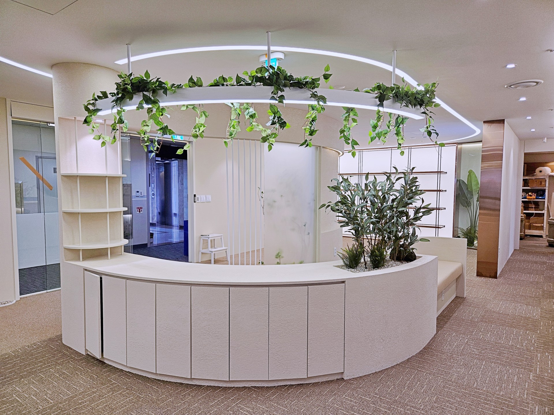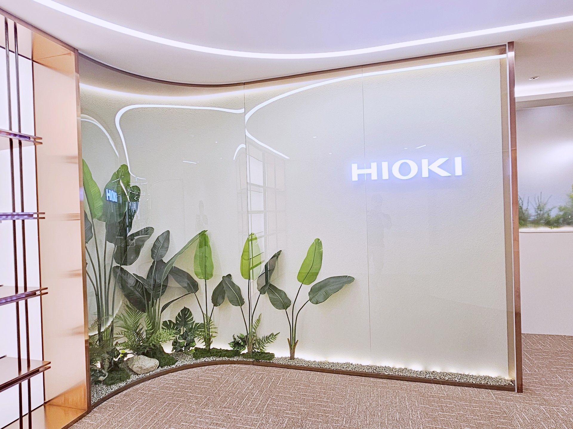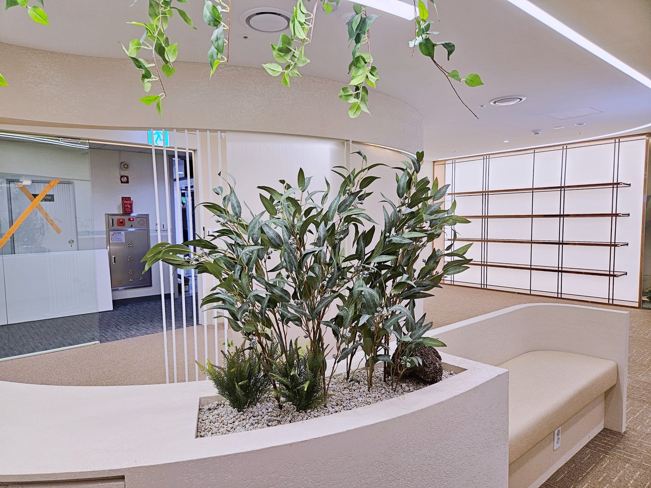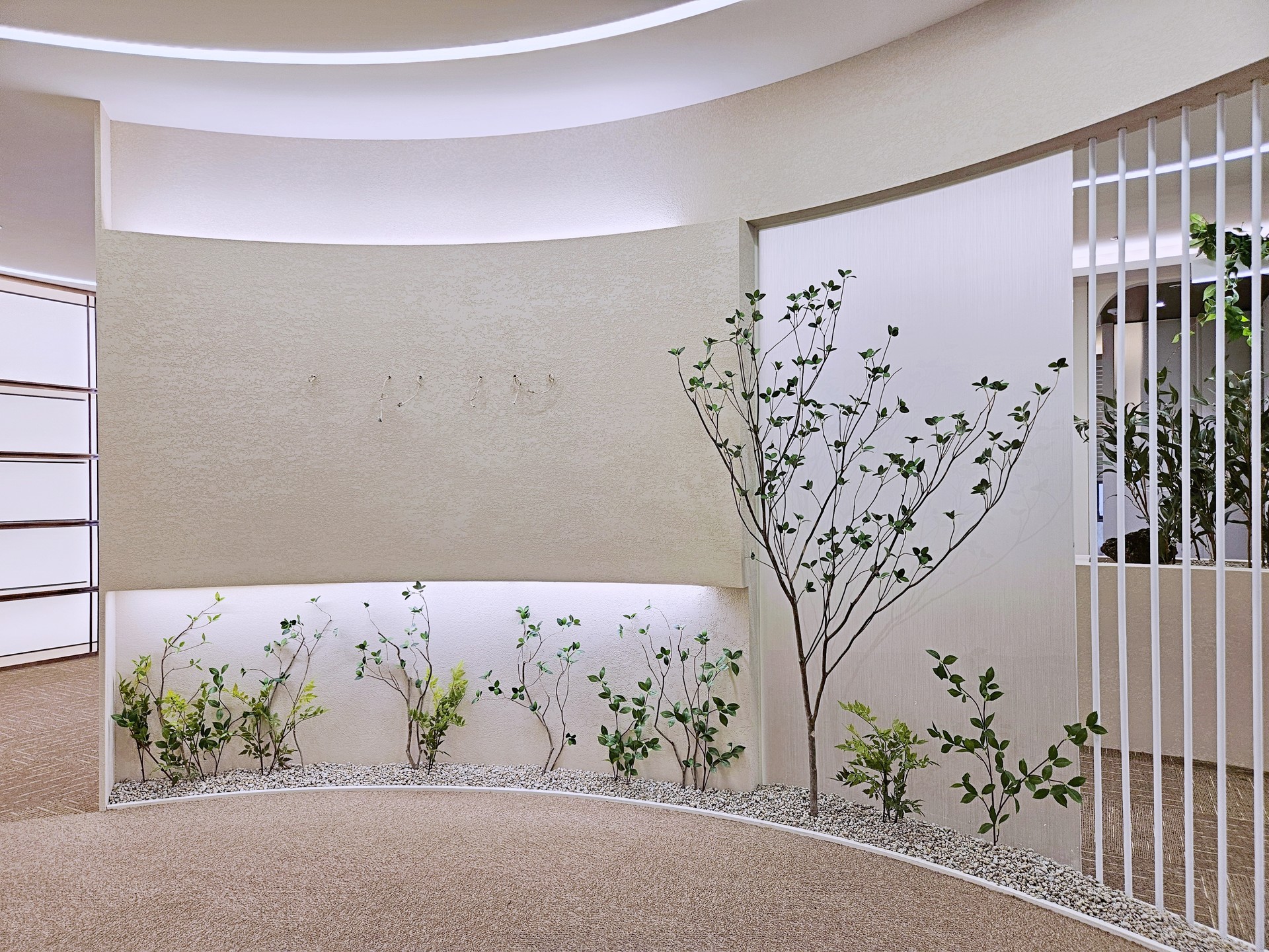 히오키의 브랜드 로고가 위치한 유리 파티션과 곡선형 가벽 하단에 풍성한 녹음을 배치하여,